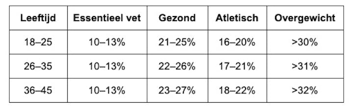 Het ideale vetpercentage verschilt per leeftijd en activiteitsniveau. Onderstaande richtlijnen zijn gebaseerd op wetenschappelijke inzichten: